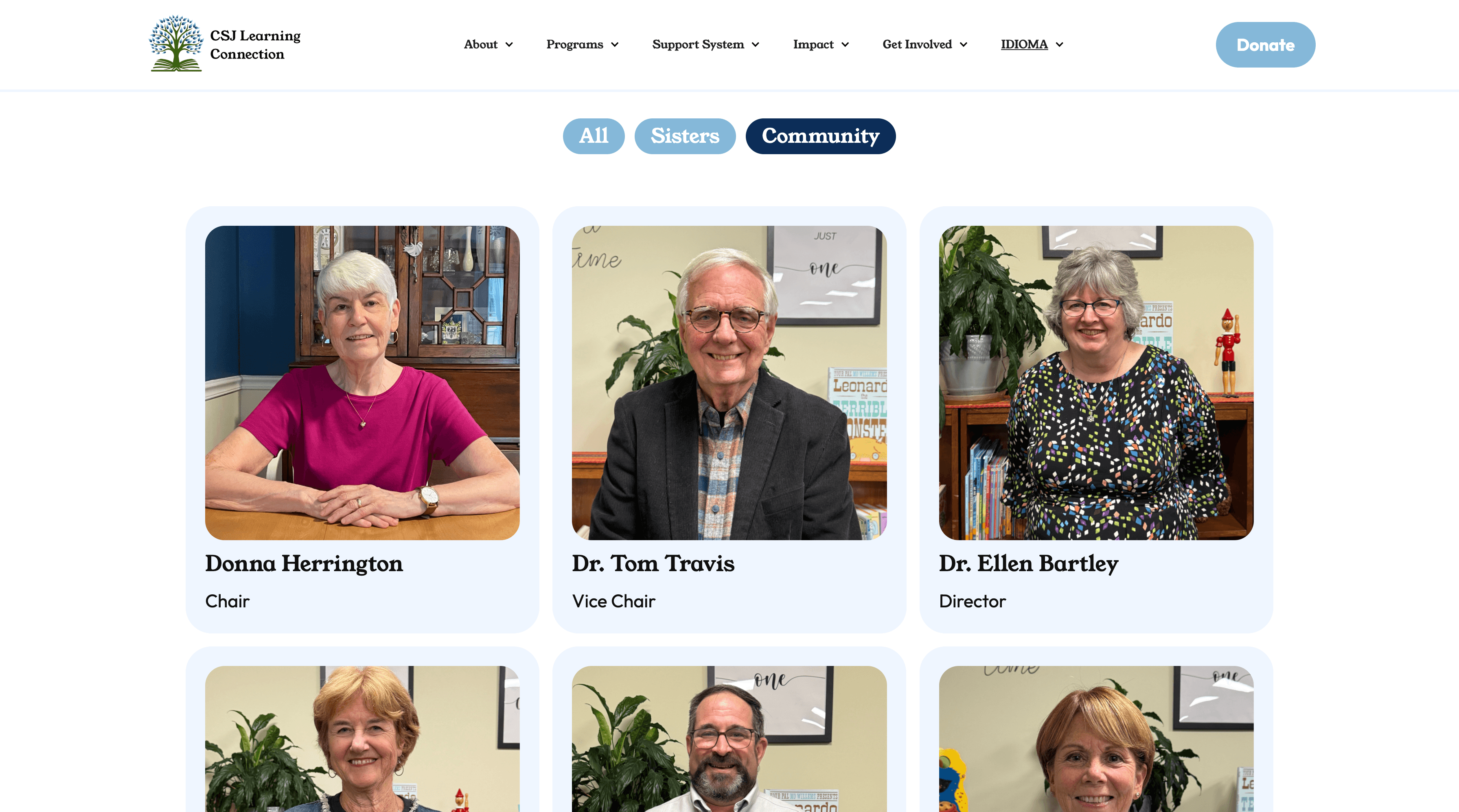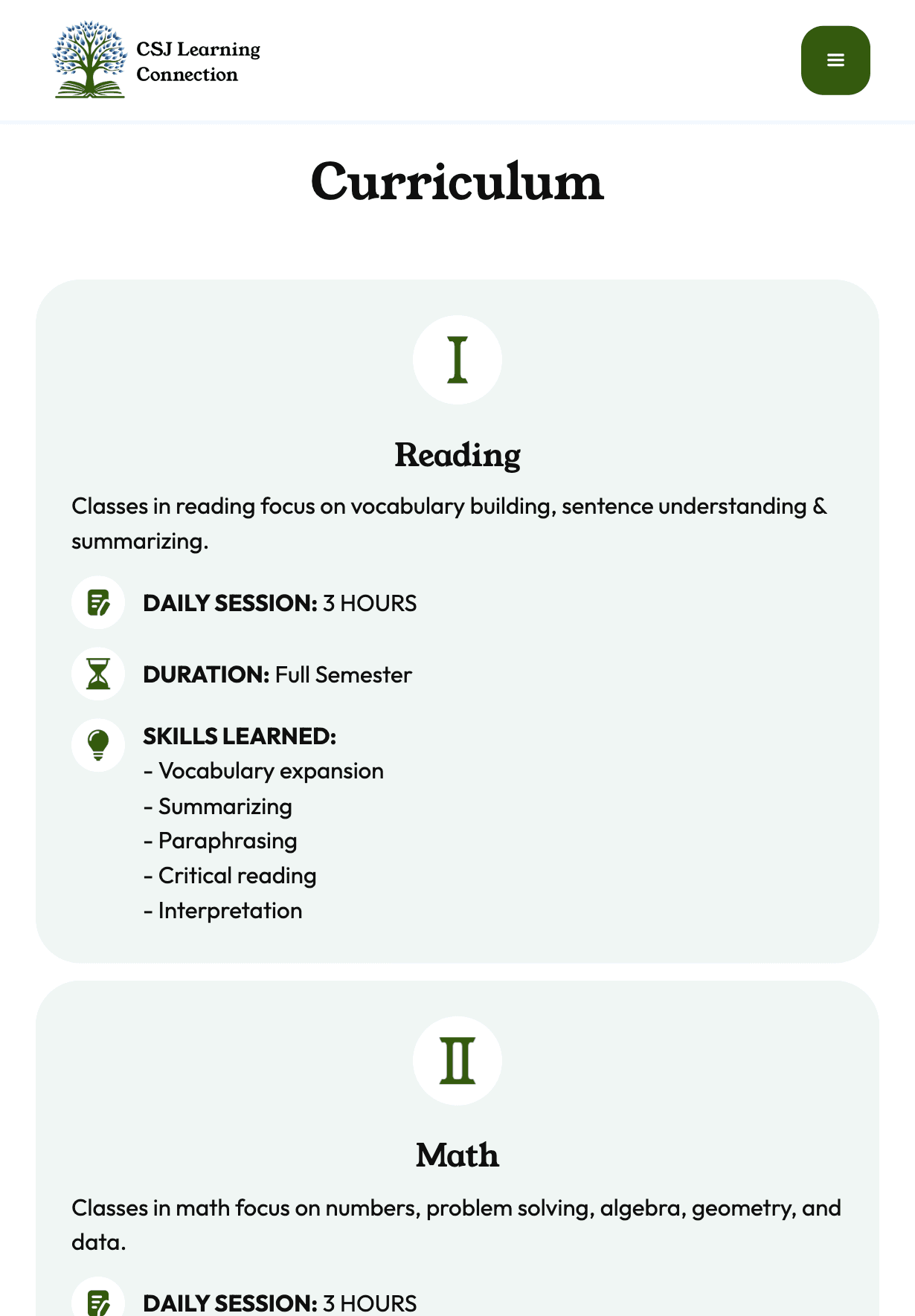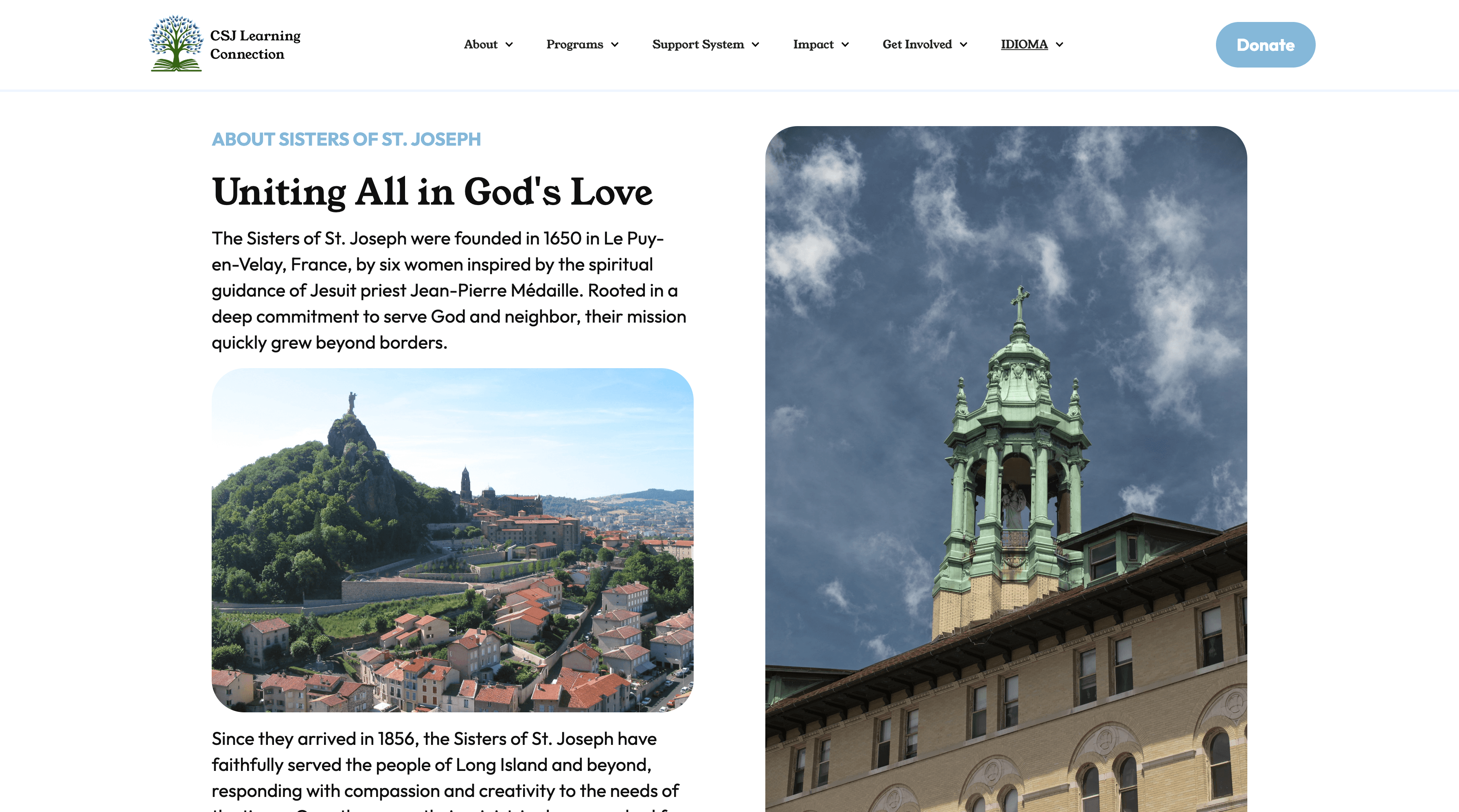 The logo was provided at the start of the project. Based on its colors, I developed the site’s color palette and proposed a typeface that balances friendliness and professionalism -values that reflect the mission and spirit of CSJ Learning Connection.