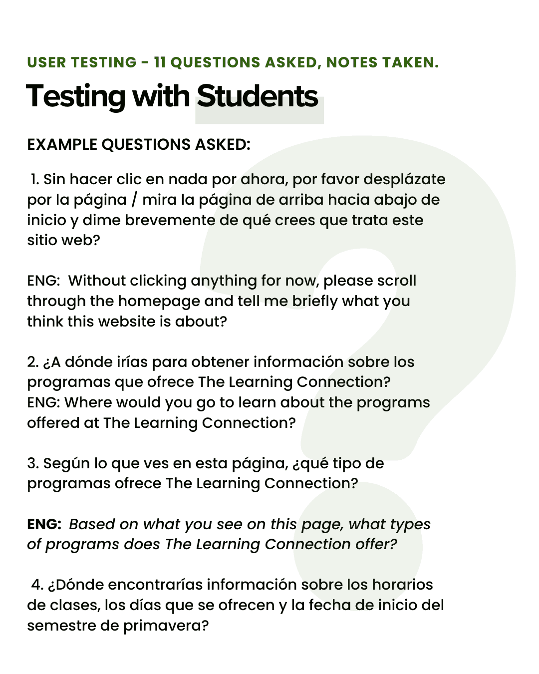 Each testing session used tailored questions aligned with specific user journeys. Insights from these conversations directly shaped the site’s structure, content, and tone. I iterated continuously based on feedback, running multiple rounds of wireframe testing on Zoom in both English and Spanish (with students) to ensure clarity and ease of use for a non-technical and non–English-speaking audience.