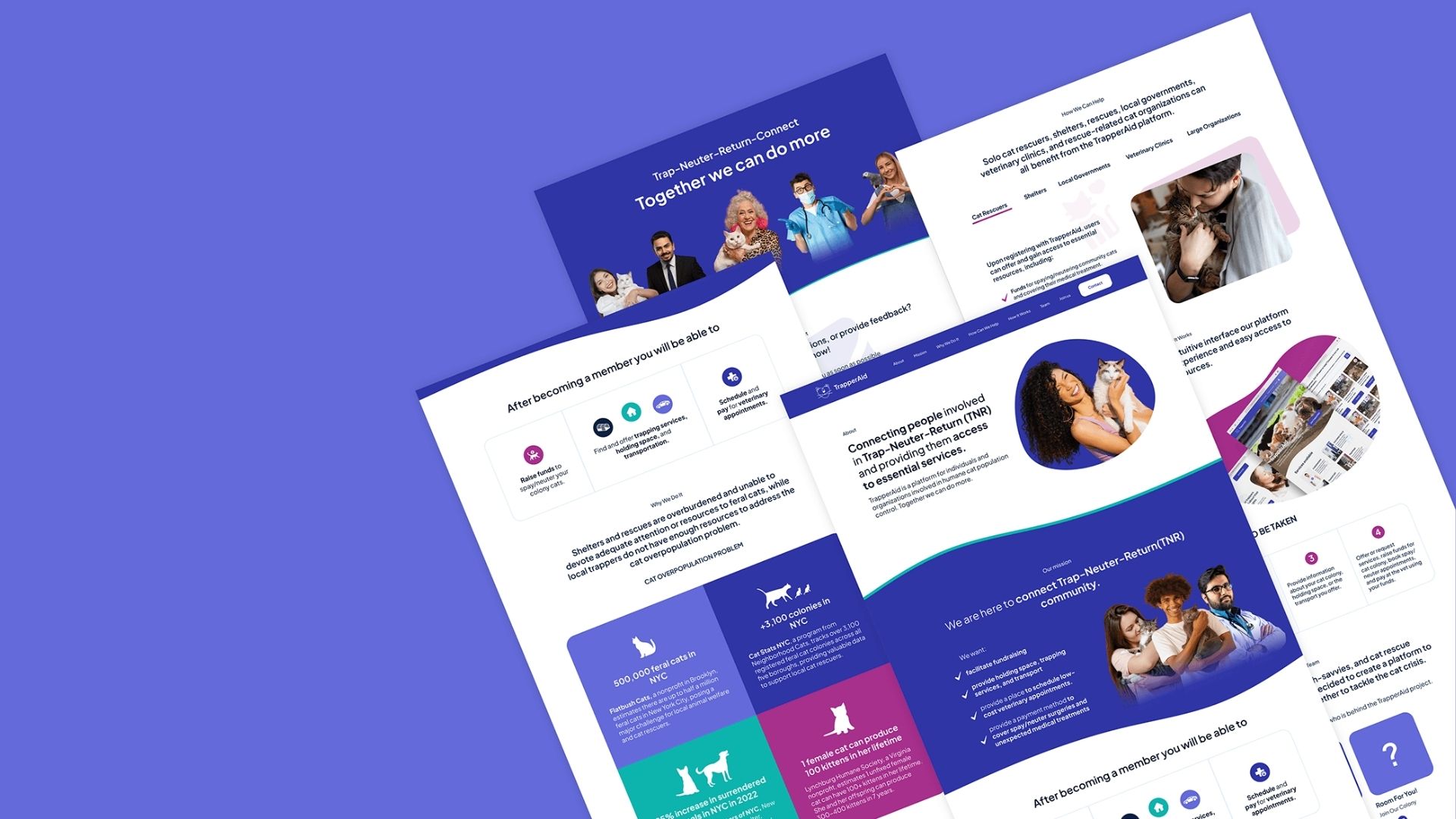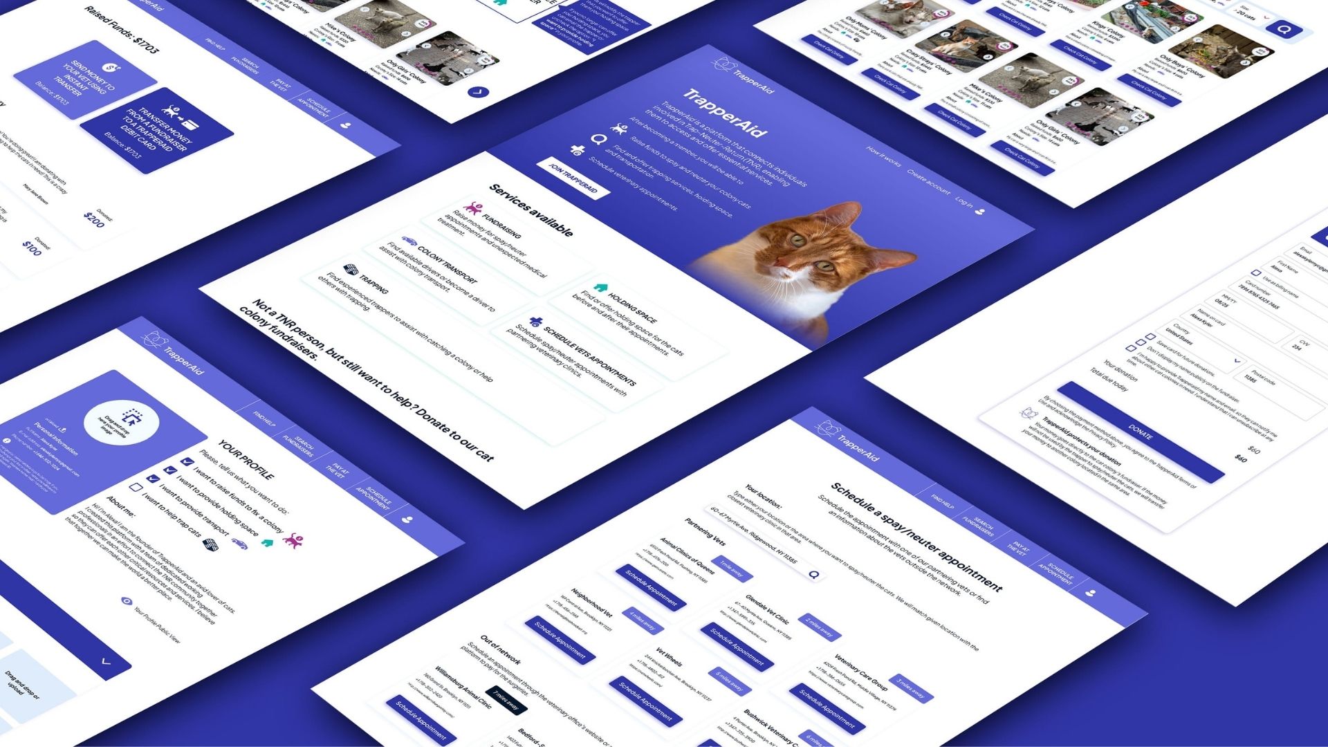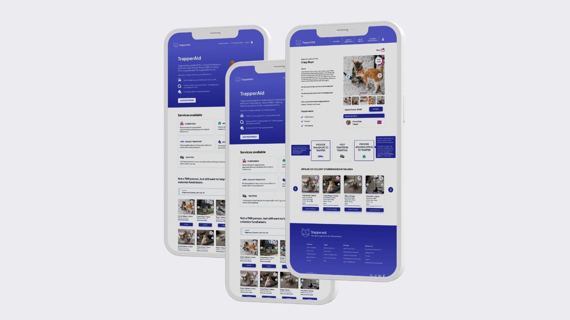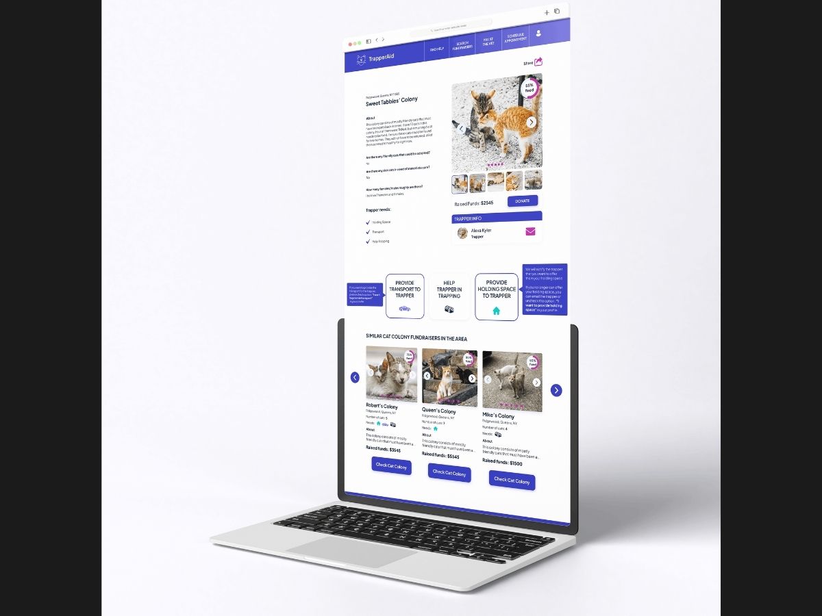 Trapperaid is a platform that connects individuals involved in Trap-Neuter-Return (TNR), enabling them to access and provide essential services for the care and management of community cats. Trapperaid was designed following a full design process - Discover, Define, Ideate, Design, and Test.
