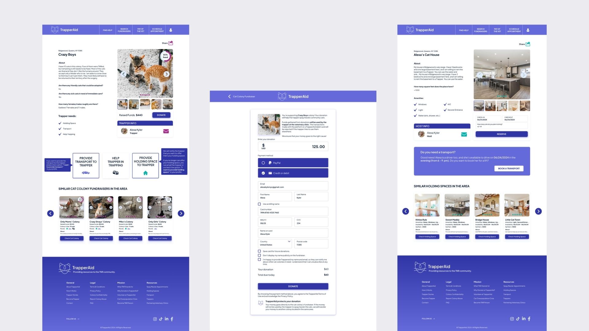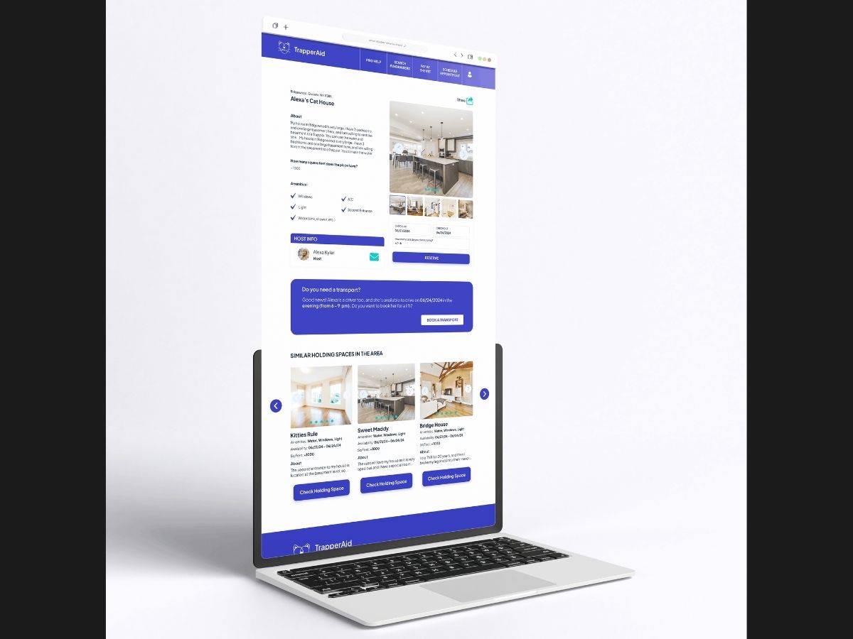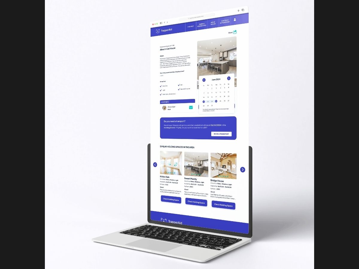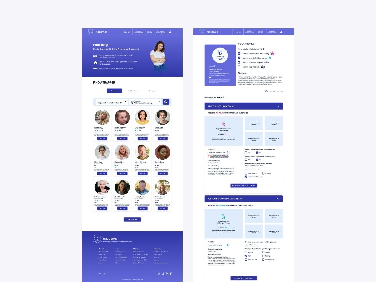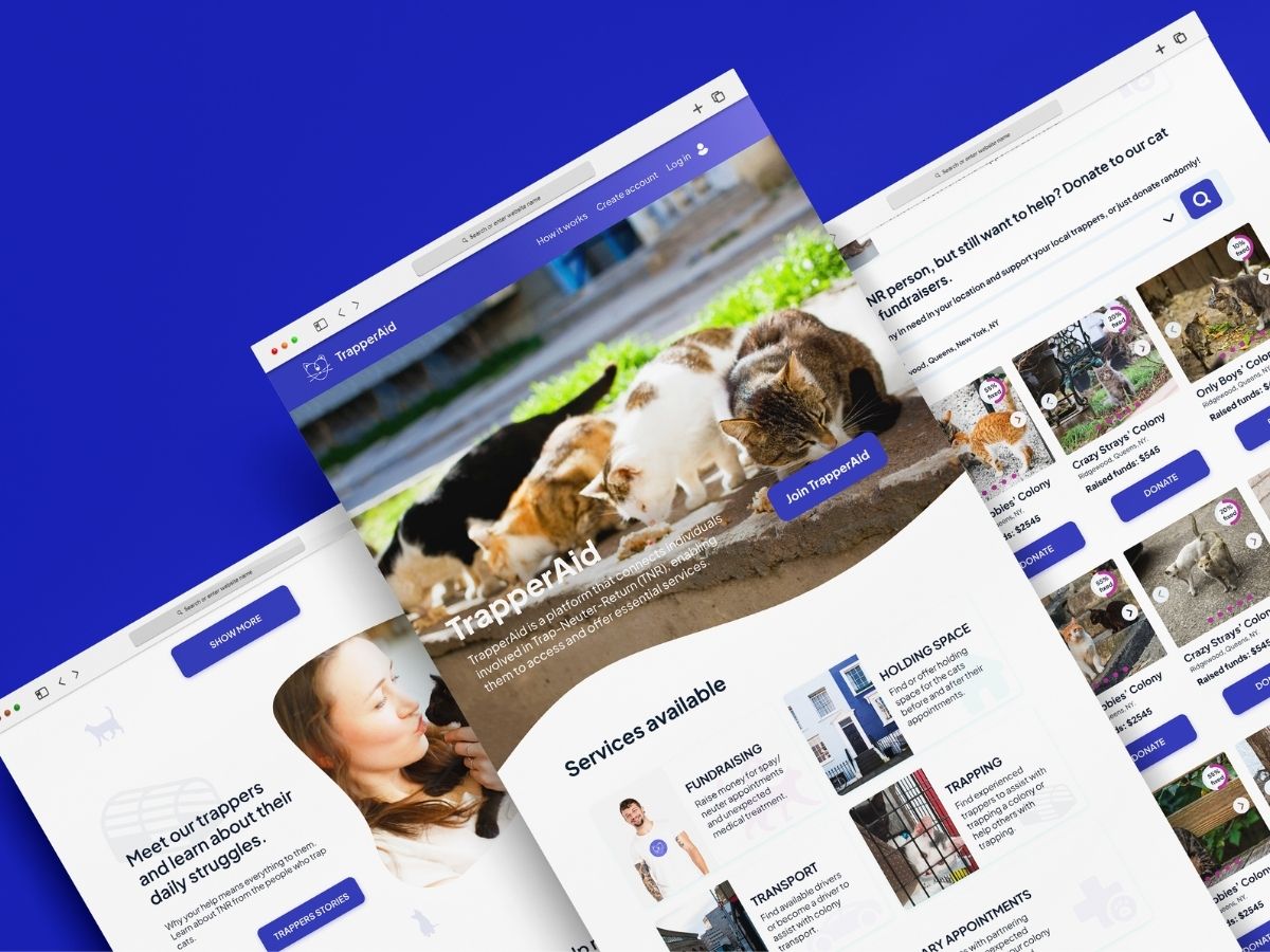 For Trapperaid, I led the UX design of the web platform, ensuring users clearly understood the purpose of the platform and who it was for. I began with UX research, interviewing individuals involved in Trap-Neuter-Return (TNR) to identify key needs. I created low-fidelity wireframes and tested them over Zoom, iterating based on feedback. The final high-fidelity wireframes focused on clear registration, easy account creation, and straightforward access to essential services - including finding a trapper, locating holding spaces, managing fundraising accounts, and checking balances. I designed the full platform structure in Figma, ensuring responsiveness across desktop, tablet, and mobile devices.